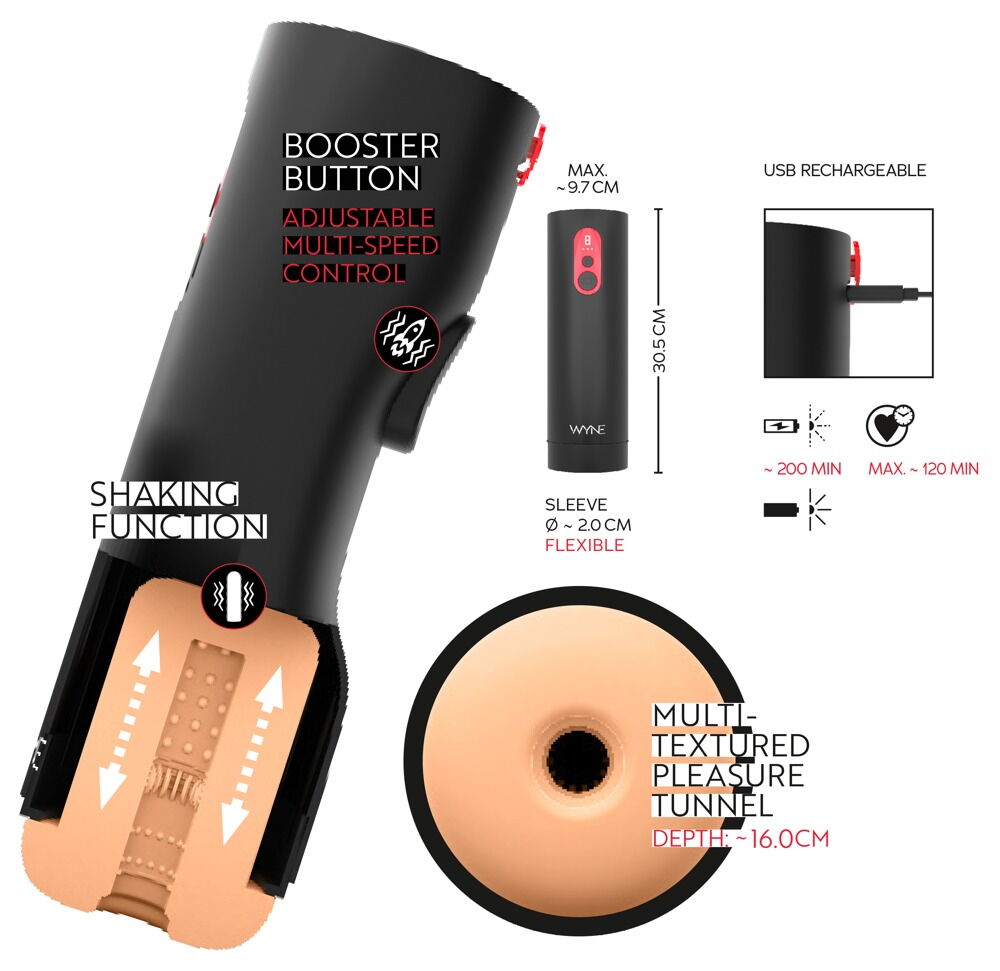 Мастурбатор с электроприводом и защитным колпачком. Двигающаяся вверх-вниз внутренняя вставка. Мягкая вставка с ребристой и рифленой структурой. Функция встряхивания в 7 режимах. Кнопка бустера для мгновенной зарядки. Простое управление со светодиодным индикатором режимов. Рукав можно снять для легкой очистки. Перезаряжаемый - в комплекте USB-кабель для зарядки.