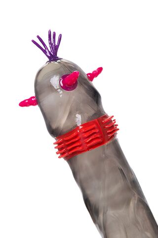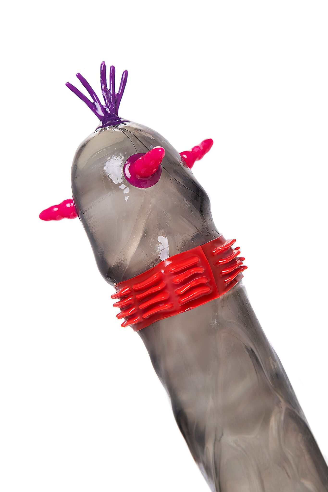 Стимулирующий презерватив черного цвета с ароматом вишни. Номинальная ширина - 52 мм.