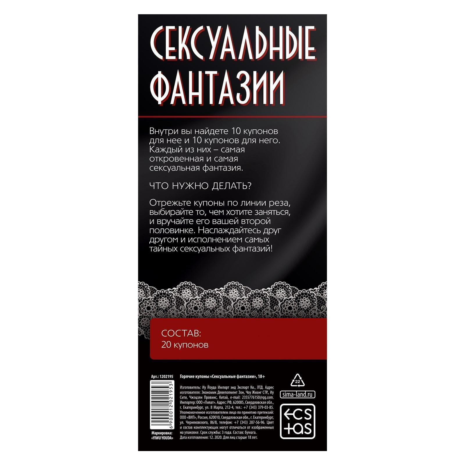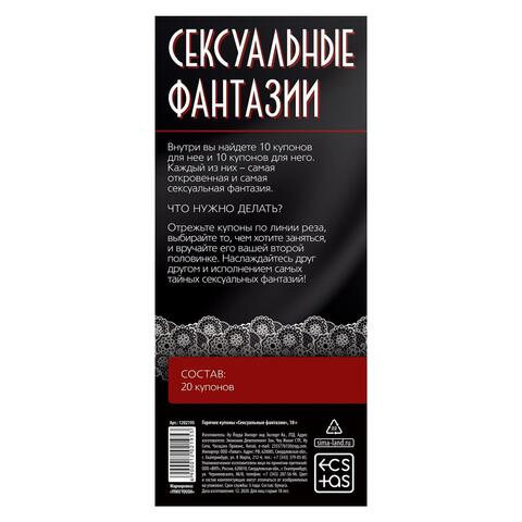 Хотите узнать самые пикантные мечты вашей половинки? Горячие купоны «Сексуальные фантазии» не только расскажут о них, но и помогут воплотить в жизнь всё, что вы когда-то задумывали.