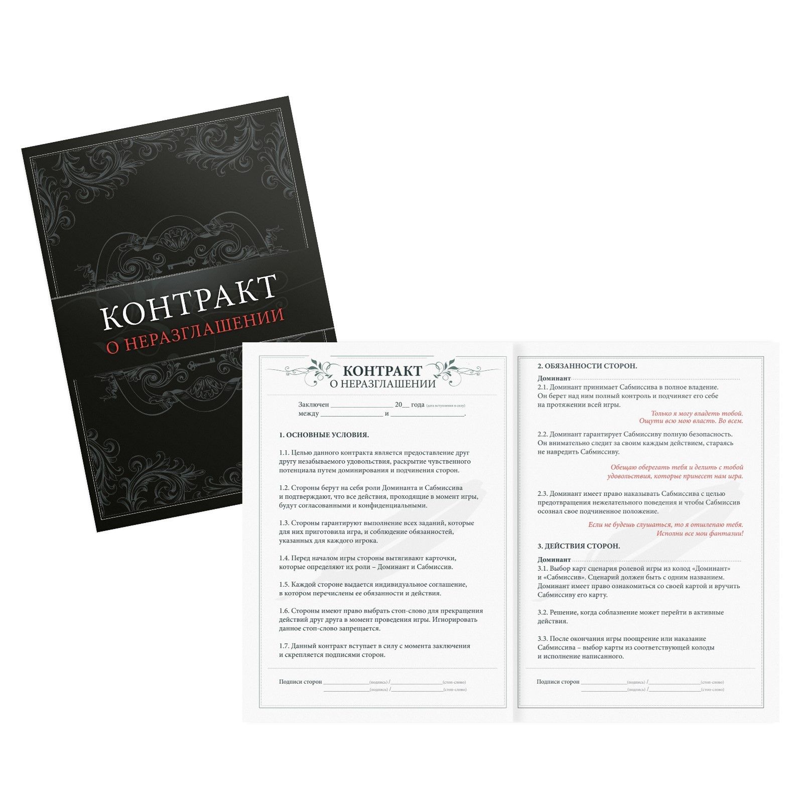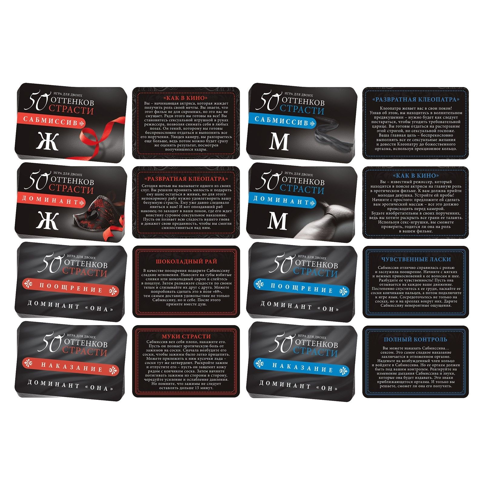 Для начала распределите роли и вручите друг другу по контракту. Кто-то из вас будет доминантом, а другой — сабмиссивом. Разыграйте один из жарких ролевых сценариев. А после решите, поощрения или наказания заслуживает сабмиссив. Вытягивайте карточки из соответствующих колод и воплощайте все фантазии в жизнь! А испытать наивысшее наслаждение от игры вам помогут горячие аксессуары. В комплекте: 2 контракта; 2 карты роли; 14 карт поощрения; 14 карт наказания; 20 карт ролевых игр; анальный стимулятор; зажимы для сосков; эрекционное кольцо.