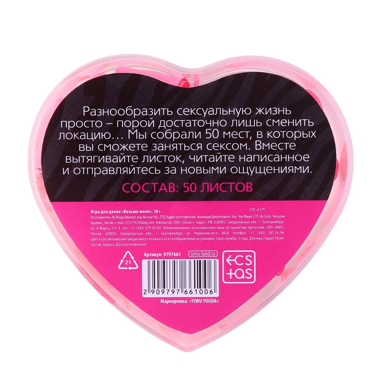 «Возьми меня» – игра, которая позволит вам с партнером опробовать новые локации, в которых привычный секс может превратиться во что-то необычное и запоминающееся. Остается лишь вместе вытянуть листок, прочитать написанное и насладиться близостью с любимым человеком. В комплекте: 50 листов.