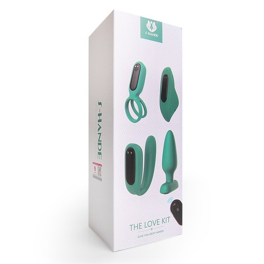 Оригинальный вибронабор в зеленом цвете The Love Kit. Состоит из перезаряжаемого виброэлемента (9 режимов вибрации) и четырех насадок: эрекционного кольца, стимулятора в трусики, стимулятора для пар и анальной пробки. Вставляйте виброэлемент в насадку, которую хотите использовать для соло-игры или вместе с партнёром, и управляйте вибрацией при помощи компактного дистанционного пульта.