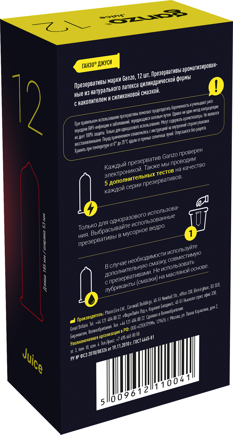 Новый GANZO – новый уровень ощущений! GANZO JUICE – твой проводник в мир сочного разнообразия. Премиальное качество натурального латекса, обильная смазка, комфортное прилегание, различные цвета и ароматы – сделают твой интимный контакт ароматно-цветным путешествием! Желтый – и ты в ванильном облаке, черный – ежевичное настроение, красный – полный тутти-фрутти. GANZO – это современный бренд презервативов, который идет в ногу со временем и готов быть твоим проводником в мир разнообразных впечатлений и удовольствий вместе с партнером. Премиальный латекс, 3-ступенчатый контроль качества, новый стильный дизайн упаковки – все это для молодых и энергичных людей, готовых выразить свою индивидуальность вместе с GANZO. Толщина стенки 0,06 мм. Размеры 185 х 53 мм. Презервативы со вкусом JUICE, ароматизированные 3 шт.