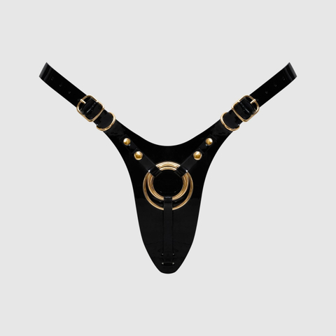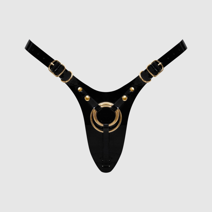 Каждая деталь тщательно продумана, чтобы сделать эти трусики коллекционной вещью: минималистичный дизайн спинки-стринга деликатно подчеркивает ягодицы, а глянцевая лакированная отделка придает ему безупречный вид высокой моды. Регулируемые лямки на бедрах обеспечивают индивидуальную посадку и полную свободу движений. Спереди расположены три сменных металлических кольца для надежного крепления любого дилдо по вашему выбору.