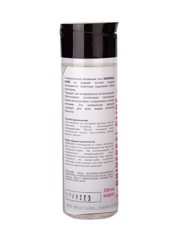 Универсальный интимный гель UNIVERSAL GLIDE на водной основе подарит максимально приятный эффект обоим партнерам. Подходит для ежедневного использования. Обеспечивает устойчивое скольжение. Можно использовать с игрушками и презервативами. Эта уникальная формула подходит для всех видов интимной близости.