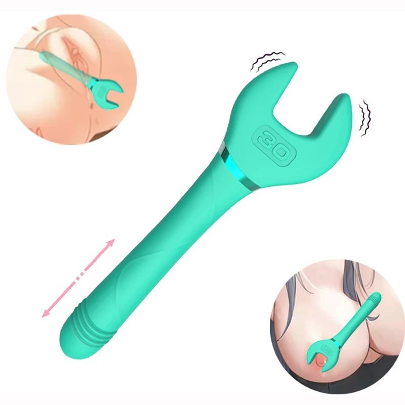 Вибромассажер в форме гаечного ключа от бренда Erokay – оригинальный и очень эффективный сексуальный аксессуар, который станет отличным пополнением вашей коллекции. Эротический девайс создан для того, чтобы дарить вам наслаждение, целенаправленно стимулируя точку G. Для этого у него есть головка и выразительный рельеф в виде колец. Кроме того, интенсивные вибрации игрушки понравятся клитору, пенису и мошонке, соскам, шее и другим внешним чувствительным зонам. Вы можете получать максимальное удовольствие во время самостоятельной мастурбации или использовать аксессуар во время захватывающих игр с партнером. Вибромассажер оснащен мощным мотором, который имеет 10 режимов вибрации и 10 режимов возвратно-поступательных движений, имитирующих фрикции. Управлять ими и переключать по своему вкусу вы можете с помощью простых и понятных кнопок на корпусе. Аккумулятор устройства перезаряжается через USB-кабель. Игрушка выполнена из безопасного для тела и очень приятного на ощупь силикона. Для максимального скольжения и более ярких и насыщенных ощущений используйте с вибромассажером лубриканты на водной и гибридной (только силикон + вода) основе. Общая длина – 24,5 см, рабочая длина – 16,5 см, диаметр – 3 см. Рекомендации по уходу: Для обработки изделия используйте той-клинер в формате спрея.