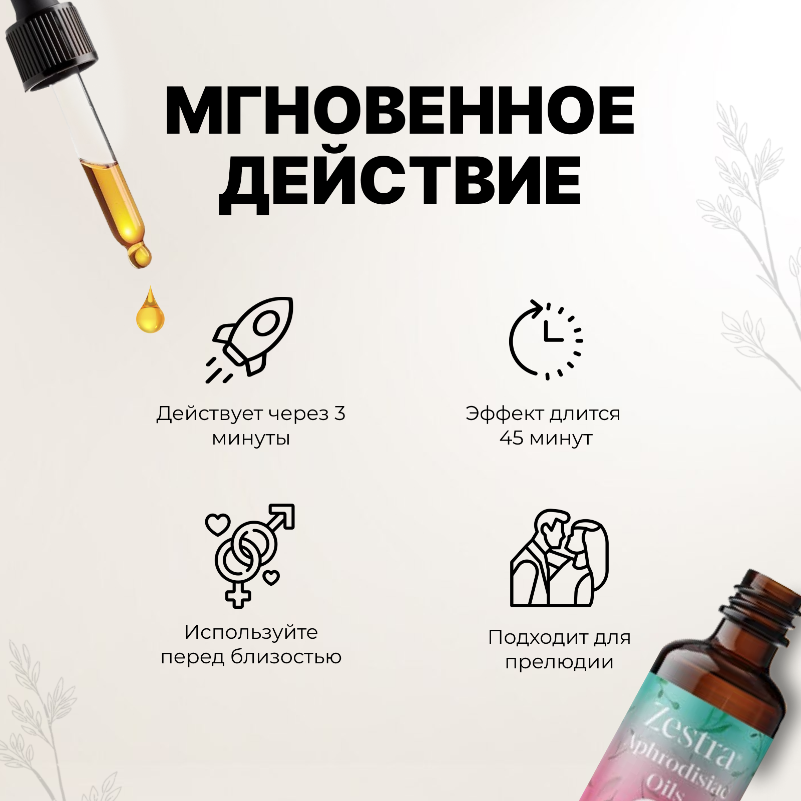 Соблазнительная формула возбуждающего масла от Zestra приятна не только для поцелуев, но и для интимной зоны. Нанесите масло на клитор до или во время прелюдий, чтобы усилить эффект от прикосновений. Через 3-5 минут после этого вы испытаете приятное покалывание и тепло. Согревающий эффект обычно достигает максимума через 10 минут и длится до 45 минут. Попробуйте новое в оральных ласках. Zestra безвредна при приеме внутрь т.к. ингредиенты средства получены из натуральных растительных компонентов, которые используют в пищевых добавках. Если вы используете дополнительную смазку во время близости, то сначала нанесите Zestra, подождите 5 минут, чтобы масло начало действовать, а затем добавьте лубрикант.Этот продукт на масляной основе поэтому безвреден для силиконовых секс-игрушек. Меры предосторожности: •не используйте с латексными презервативами•не применяйте при беременности •не наносите при заболеваниях половых органов•при неприятных ощущениях смойте водой с мылом. Объем 15 мл.